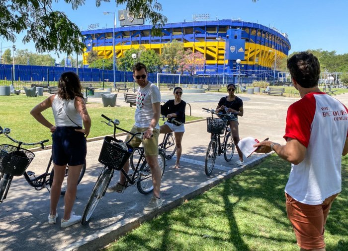Du cykler videre gennem byens parker og stræder mod det farverige arbejderkvarter La Boca, hvor der gøres et kort ophold med tid til en slentretur eller en forfriskning. I denne bydel holder et af byens berømte fodboldhold til, Boca Juniors, og du cykler lige forbi deres store blå- og gulmalede stadion.