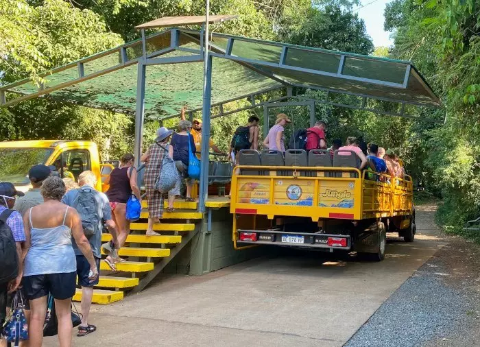 Første del af turen går med 4WD bus igennem junglen ad en 5 km grusvej ned til havnen. Herfra går en stejl trappe ned til havnen, hvor en speedbåd venter på at tage dig med op ad floden mod de larmende og brusende vandfald.