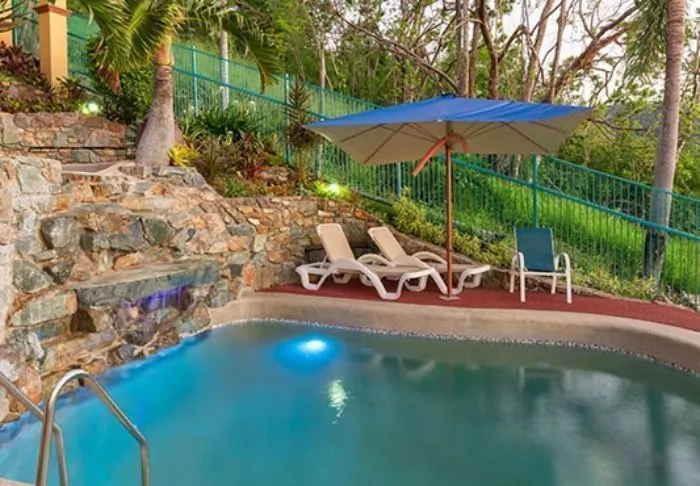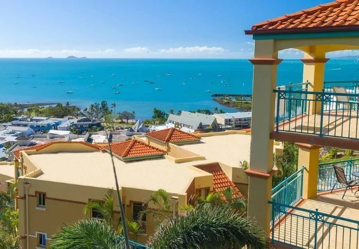 Toscana Village Resort har en fantastisk beliggenhed på en lille bakke med panoramaudsigt ned over byen og Koralhavet med Whitsunday-øerne i baggrunden.