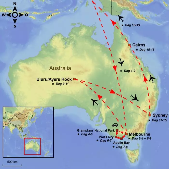 Tag med på et kør selv-eventyr på én af verdens smukkeste kyststrækninger, Great Ocean Road. Oplev landets to største byer, Melbourne og Sydney, den endeløse røde ørken med Uluru og slut af med afslapning i tropiske omgivelser i Cairns.
