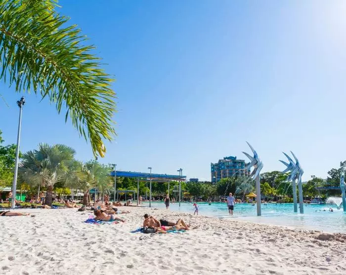 Cairns er en livlig kystby i det nordlige Queensland, og byen er nok mest kendt som porten til Great Barrier Reef, verdens største koralrev. Byen byder desuden på masser af aktiviteter, caféer, restauranter og butikker. Her er ingen strand, men for at kompensere for dette har man midt i byen bygget en stor kunstig lagune, hvor du både kan nyde solen og bade.