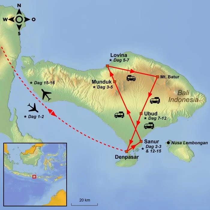 Rejsen starter med en nat i badebyen Sanur, hvor du kan slappe af efter den lange flyrejse og vænne dig til tidsforskellen og de varmere temperaturer.