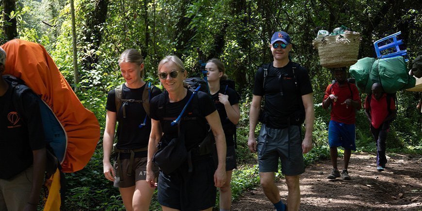 Familie går på rad og række op ad Kilimanjaro