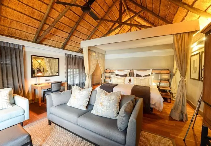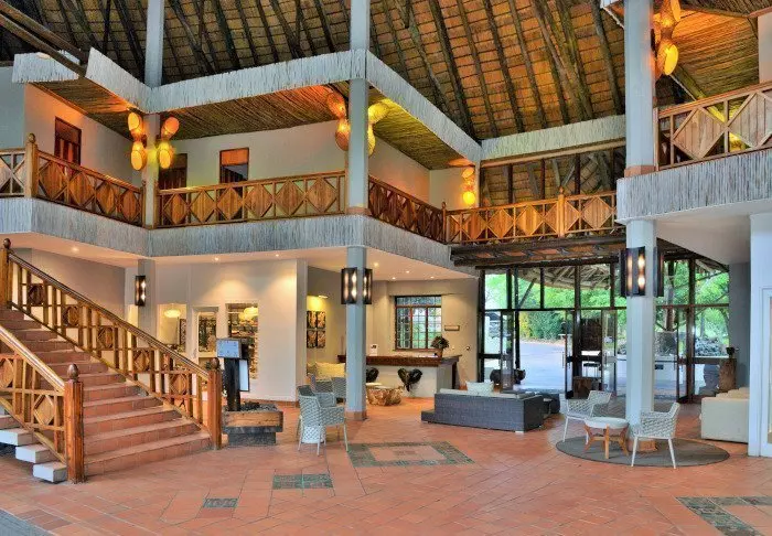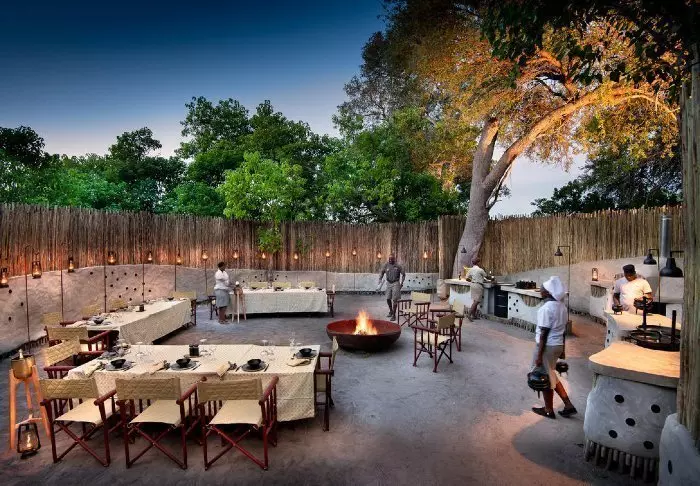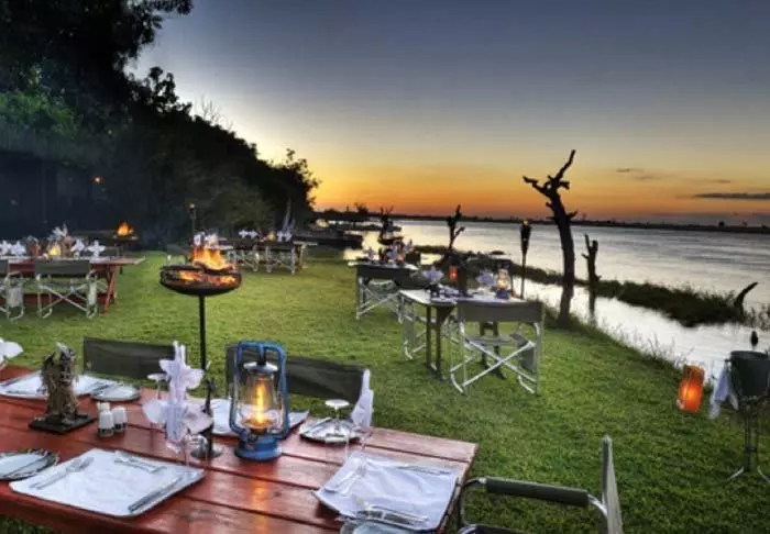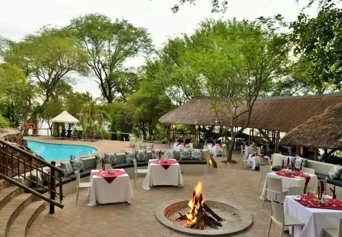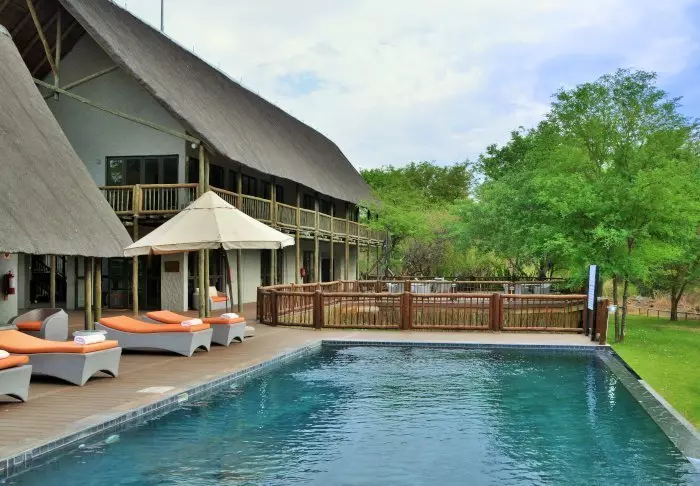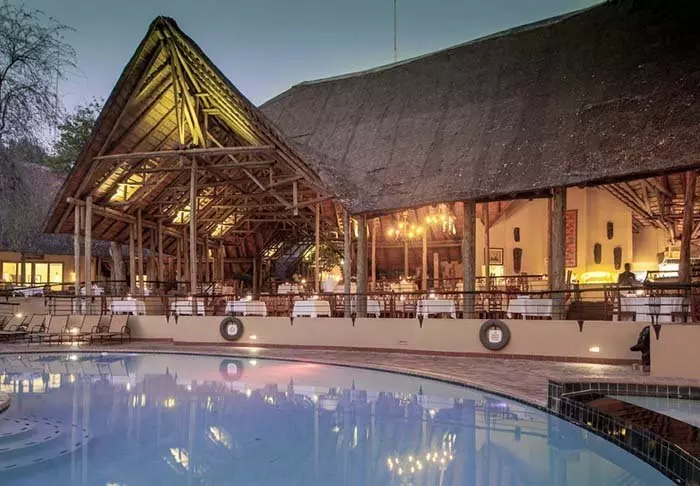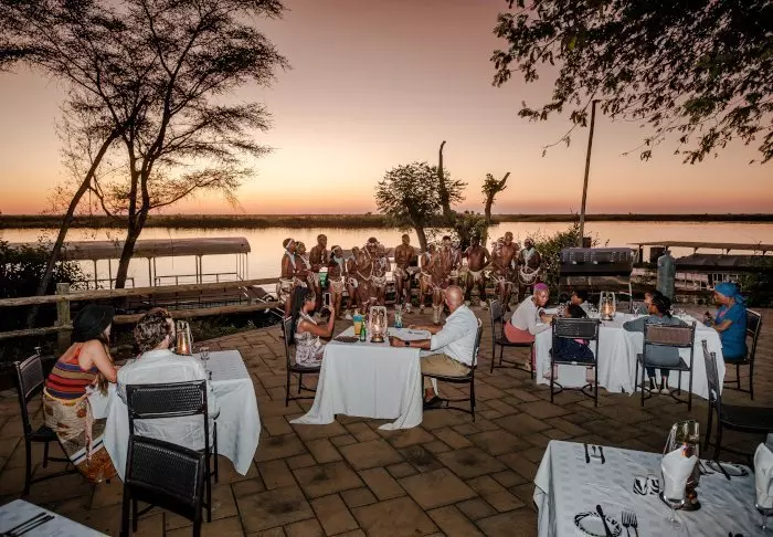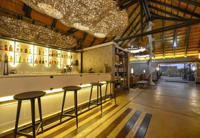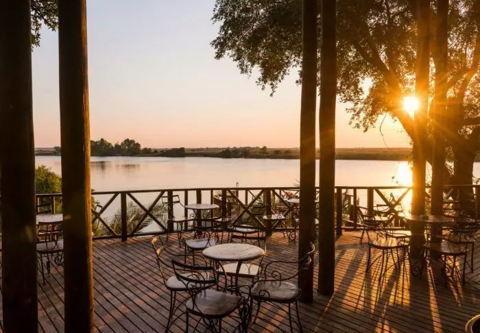 Lodgen har to restauranter, spa og to barer, hvoraf den ene er perfekt til en ”sundowner” med udsigt til floden og solen, der går ned over nationalparken.