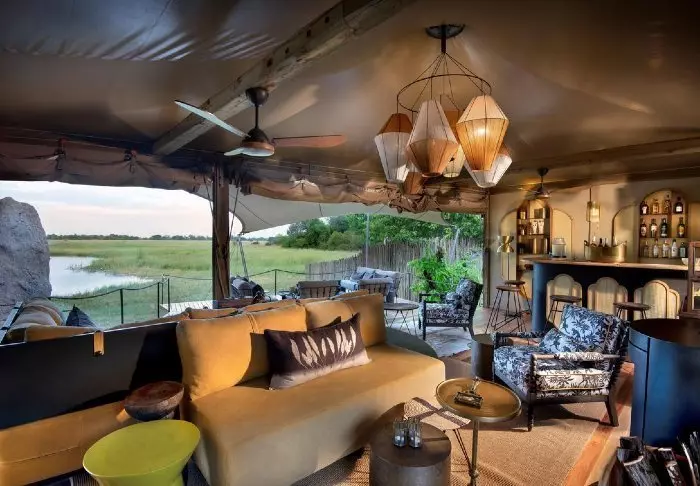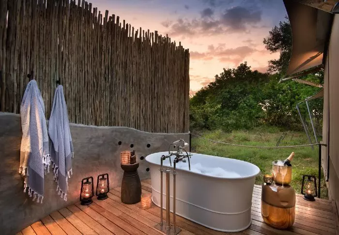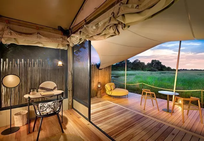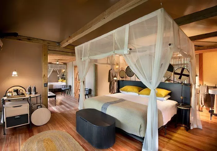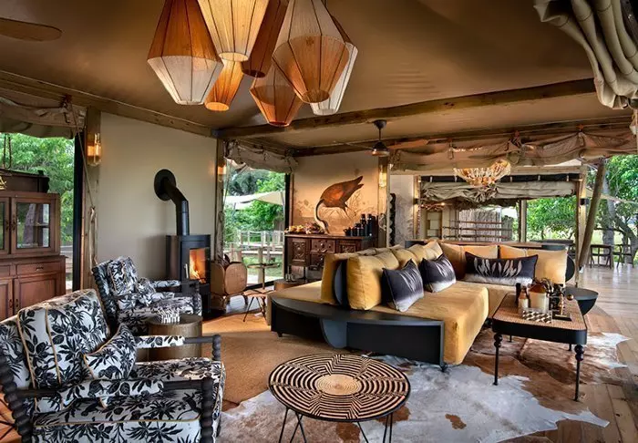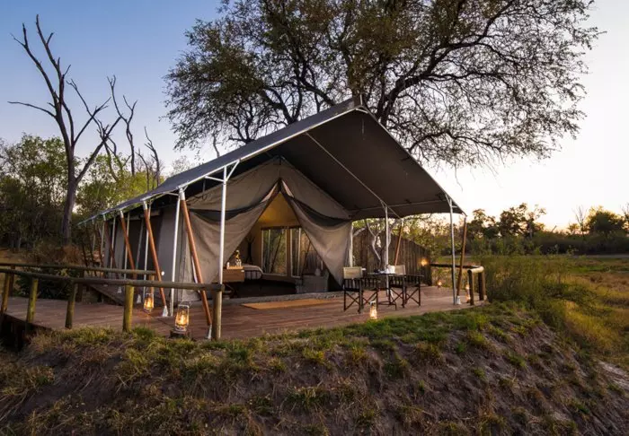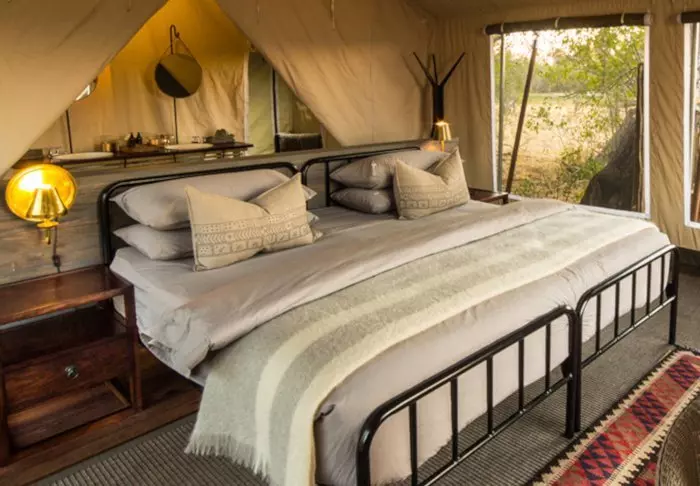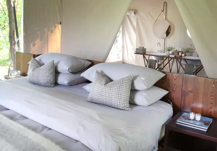Der er ingen permanente konstruktioner i campen, hvilket er med til at give følelsen af virkelig at være midt naturen, men inde i dit telt føles det som luksus. Midt i teltet står den bløde seng, og du har dit eget badeværelse med rindende vand og indendørs og udendørs bruser. Alle telte er rejst på platforme, og fra de charmerende verandaer er der en flot udsigt over området.