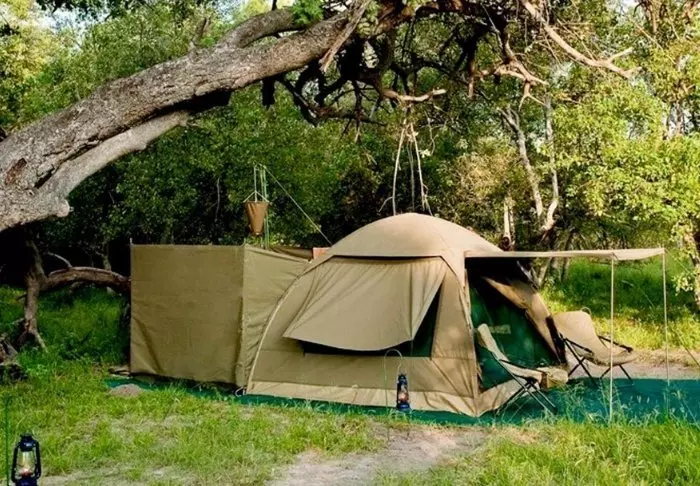 Udenfor teltet er der et lille skyggefuldt overdække med stole, så du kan nyde udsigten til naturen omkring dig. Du sover på en komfortable feltseng med en dejlig blød madras, rigtige dyner og puder og et lille natbord ved siden af. I direkte forlængelse af dit telt, har du dit eget bush-badeværelse med brusebad og toilet. Der er ikke elektricitet eller rindende vand i teltet, og toilettes skyllefunktion består af en bunke jord og en lille skovl – men der ER et toilet! Flere gange om dagen forsynes du med varmt vand og kan vaske dig i et lille bassin, som står i et stativ udenfor teltet. Hvis du har set filmen ”Out of Africa” ved du præcis, hvordan det foregår. Om eftermiddagen bliver der varmet vand, som bliver hejst op i en spand med et brusehoved nedenunder, så du kan få dit dejligt varme brusebad. Det er primitivt, men komfortabelt, og vigtigt af alt; det er overnatning på naturens præmisser, hvor du ikke efterlader nogle spor, mens du kommer helt tæt på dyrelivet i deltaet.
