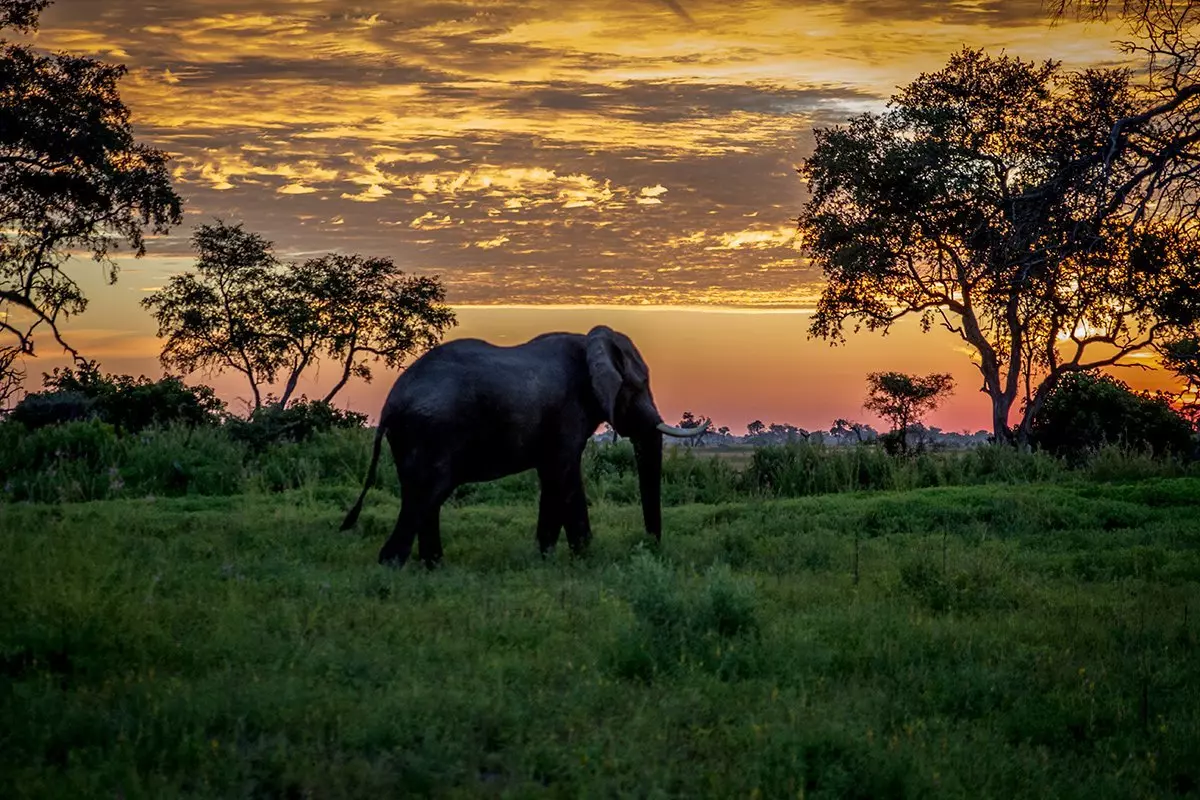 Solnedgangene i Okavango-deltaet er ganske ubeskrivelige. Halvdøde træer, som spejler sig i vandet, elefanter, der bliver til silhuetter, og himlen der bliver helt lilla og lyserød tager pusten fra de fleste.