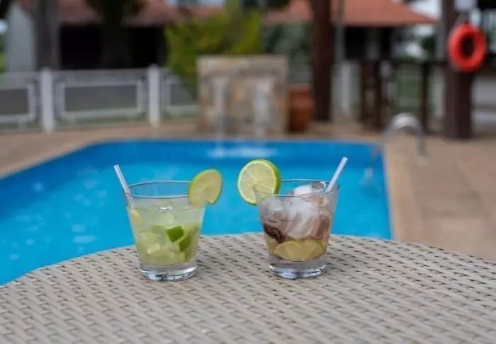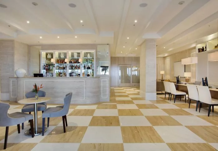 Servering fra baren sker både i restauranten, ved hotellets egne liggestole på strandpromenaden og ved swimmingpoolen.