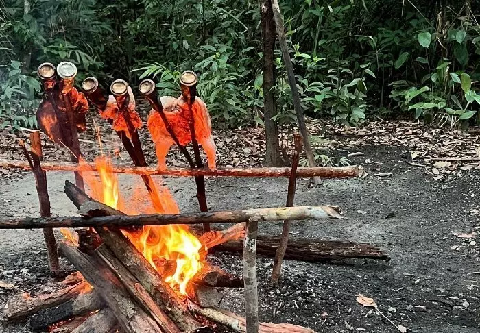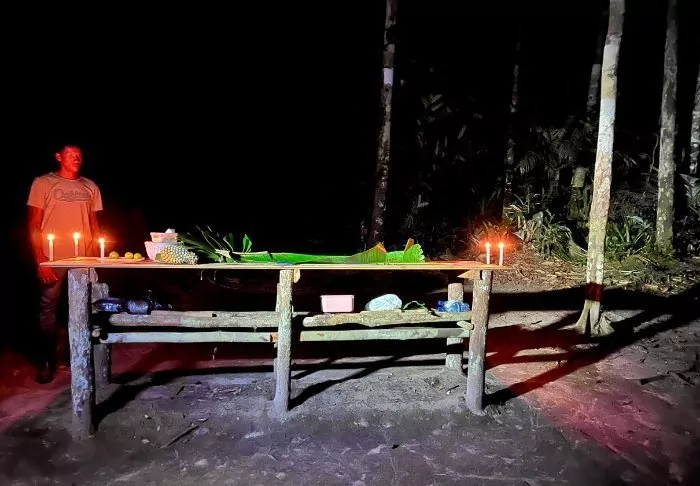Om aftenen laver I sammen middag over bål, som serveres på bananblade.