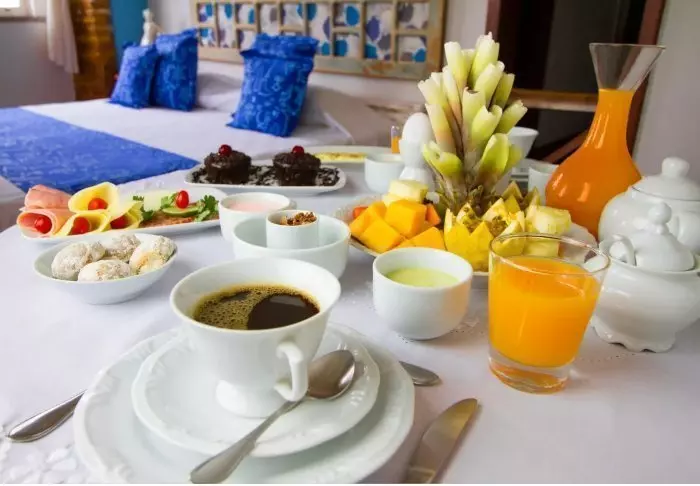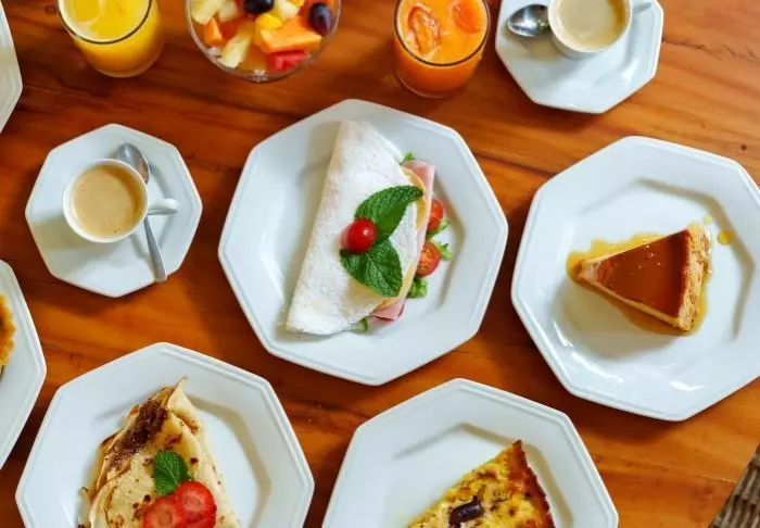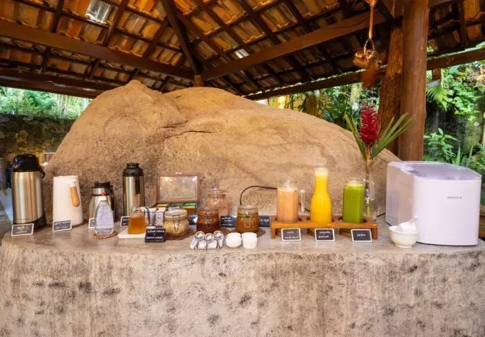 Morgenmaden serveres på værelset på et ønsket tidspunkt, og består bl.a. af hjemmebagt brød, frugt og lækkerier fra det lokale køkken, som f.eks. tapioka-pandekager.