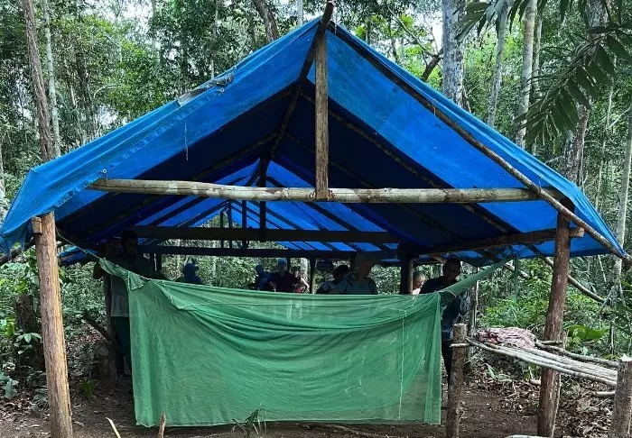 Sammen med din guide og de andre gæster fra lodgen vandrer I ca. 15 minutter ind i junglen, indtil I ankommer til det område, hvor der skal slås lejr for natten. Her hænger du din udleverede hængekøje og myggenet op under en presenning, hvor du skal sove natten over. Du får også udleveret et tæppe til natten.
