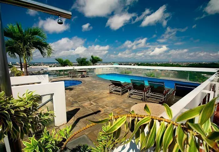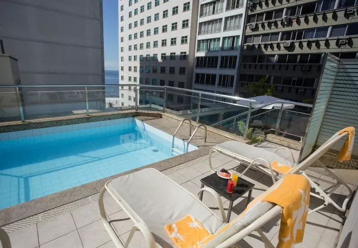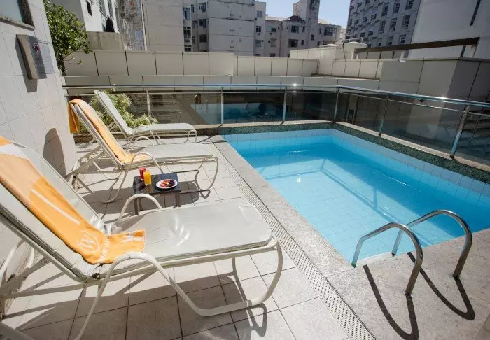 Hotellets swimmingpool ligger også på øverste etage, og her kan du tage dig en dukkert i poolen eller slappe af i en liggestol med udsigt ned over Copacabana.