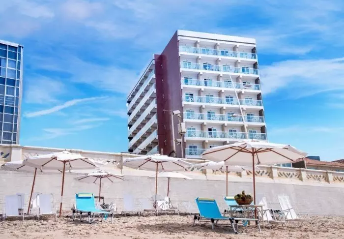 Foran hotellet kan du slappe af på den lækre solterrasse med liggestole og direkte adgang til stranden.