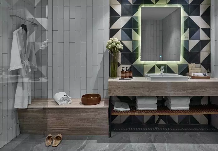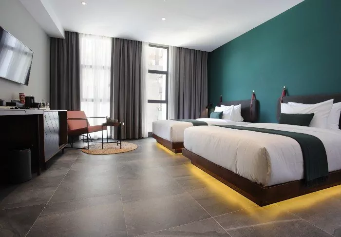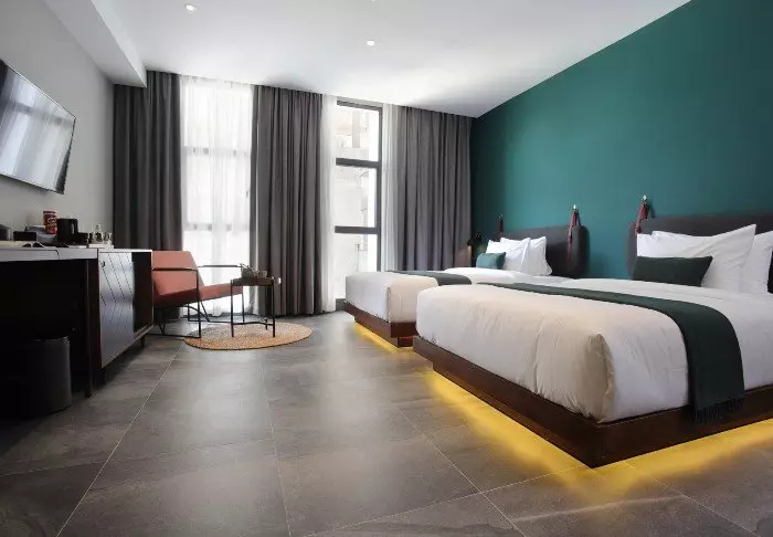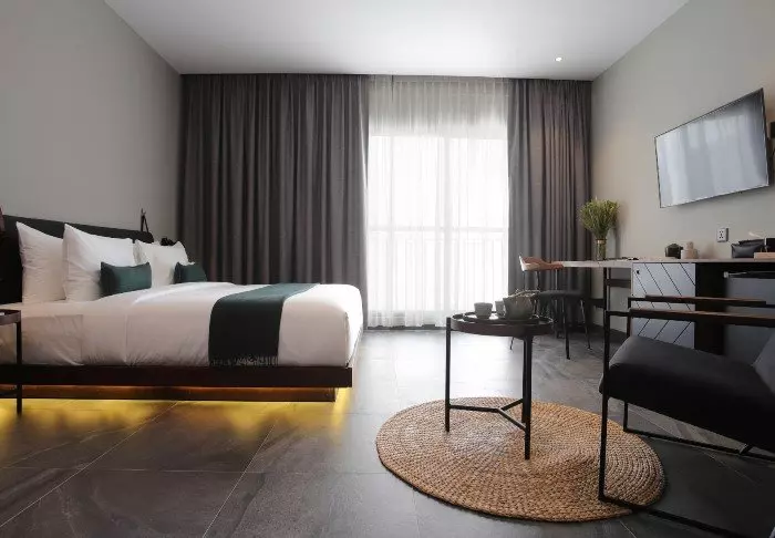 Det rustikke og moderne look går igen i værelserne, som både er utroligt indbydende og hyggeligt indrettet med varme farver. Samtlige 105 værelser har både aircondition, wi-fi, minibar, værdiboks samt elkedel, så du kan lave dig en kop te eller kaffe. På badeværelset finder du badekåbe, tøfler samt toiletartikler og hårtørrer.