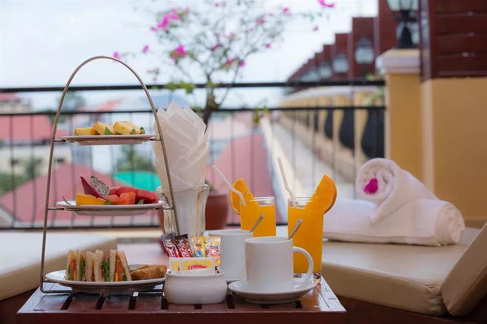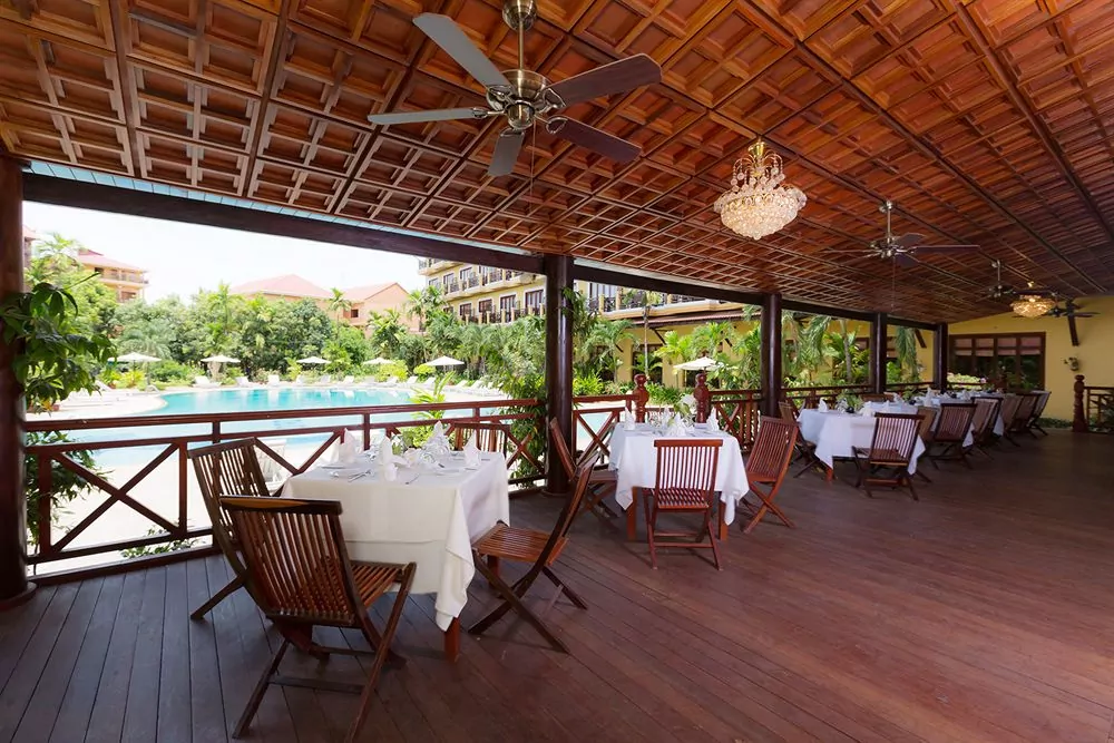 Ved siden af swimmingpoolen finder du hotellets restaurant og bar. Restauranten tilbyder både buffet og a la carte med retter fra både det internationale og cambodianske køkken, mens baren byder på øl, vin, bobler og farverige cocktails.