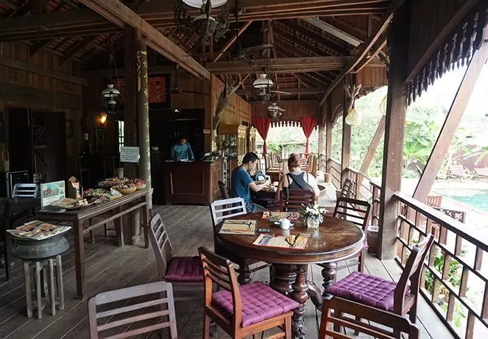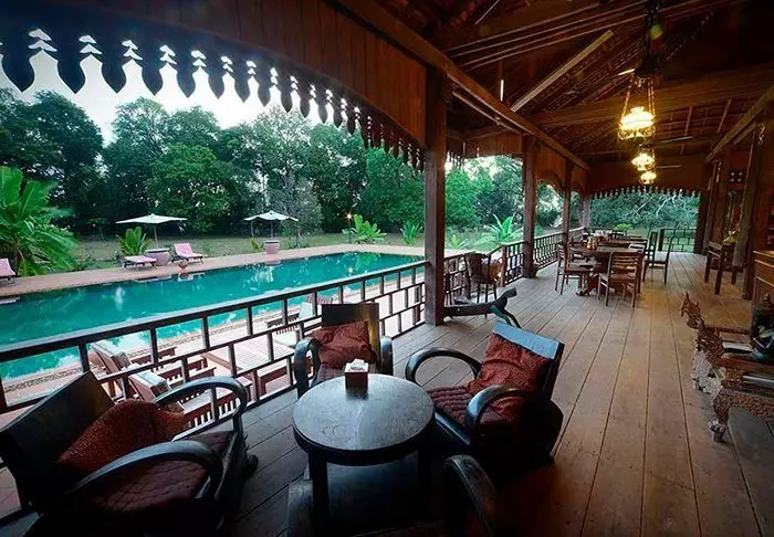 Den hyggelige restaurant ligger på en overdækket terrasse med udsigt til haven og swimmingpoolen. Her fremtrylles både til morgen, middag og aften lækre retter fra det cambodianske og internationale køkken. Et velassorteret vinkort findes også.