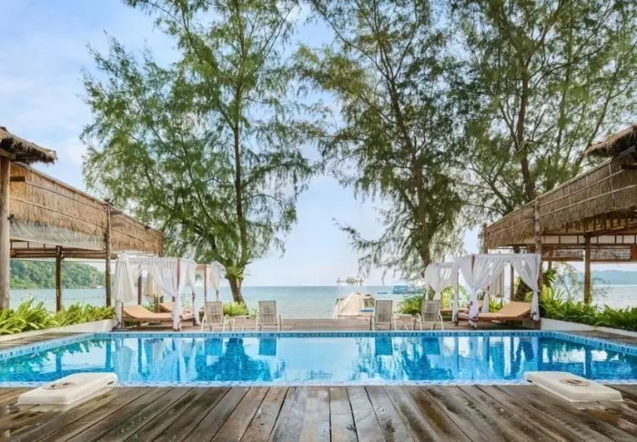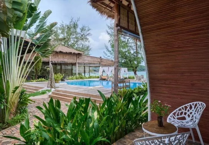 Veranda Natural Resort ligger på en frodig skråning nedenfor Kep Nationalpark, og med udsigt over Thailandbugten, Tonsay ø og Phnom Bokor Nationalpark i horisonten. Resortet breder sig over 2,5 hektarer i et naturskønt område, så der er masser af plads til at boltre sig men også til at finde fred og ro. Resortet er indrettet med øje for skønhed, ro og god mad. Fra resortets hovedbygning er der trægangbroer gennem det grønne område til værelserne. De rummelige værelser på 30 m², er individuelt indrettet i minimalistisk stil med luksuriøse materialer, aircondition, gratis wifi, kaffe-/tefaciliteter, minibar, tv, værdiboks, badekåber, hårtørrer, eget badeværelse og en veranda.