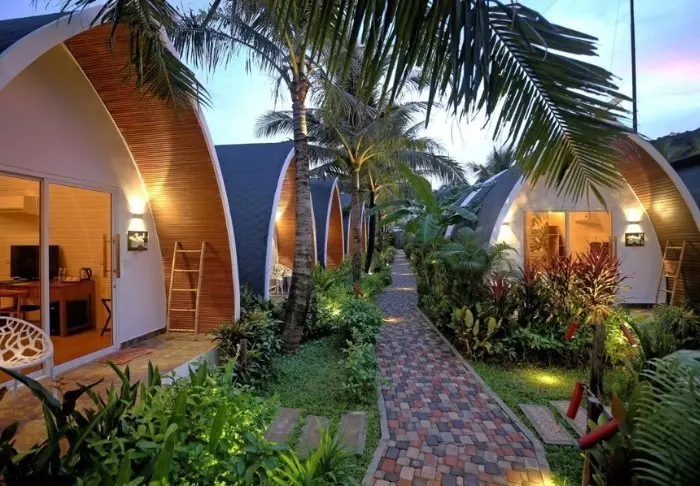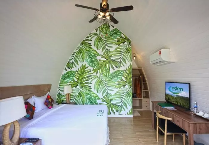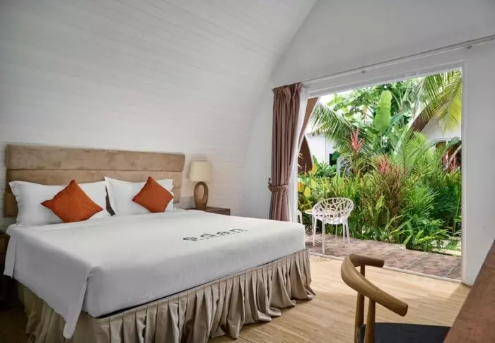 Resortets 33 bungalows er lyse og smagfuldt indrettet med bæredygtige materialer. De er alle udstyret med aircondition, loftvifte, wi-fi, minibar, kaffe- og tefaciliteter, tv og køleskab. En skydedør åbner ud til en privat balkon med bord og stole, hvor du kan nyde roen og de frodige omgivelser. Badeværelserne er udstyret med bruser, hårtørrer og toiletartikler, som er med til at fuldende komfortoplevelsen.