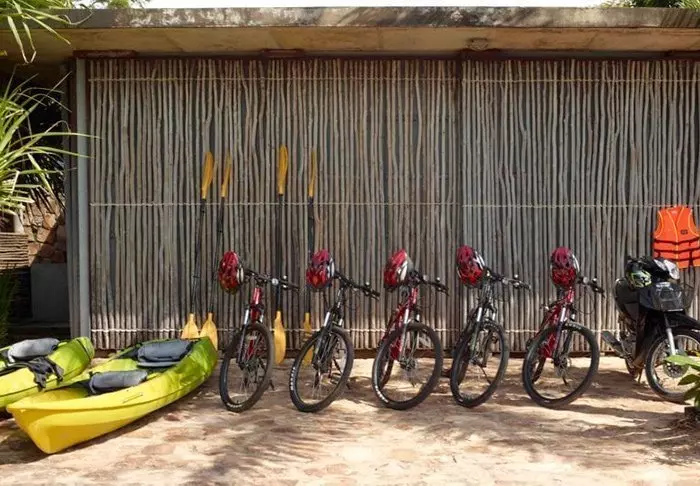 Resortet ligger ca. 2,5 km fra flodlejet, hvor båden fra Kratie lægger til. Afhængigt af vandstandens højde i Mekong-floden går du i tørtiden max. 900 m hen over den brede strand og op til cykelstien, hvorfra en tuk tuk kører dig frem og tilbage til hotellet. I regntiden hvor vandstanden er høj, forsvinder stranden næsten helt og du slipper for at gå hen over den brede strand, da båden kan lægge til næsten helt oppe ved cykelstien. Din bagage bliver transporteret fra flodlejet og helt frem til hotellet.