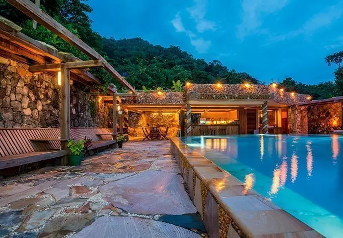 Haven er som en lille oase med masser af grønne, tropiske planter og sågar palmer og damme. Her er fred og ro, som kun afbrydes af den brusende jacuzzi, hvis vand falder som et vandfald ned i poolen nedenfor.