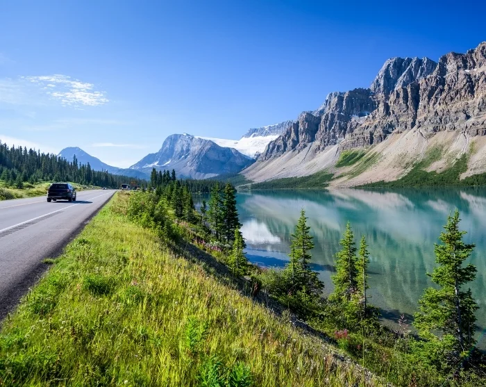 Fra det lune bilsæde kan du nyde det utrolige landskab folde sig ud som en film foran dig, og her venter dig mødet med naturvidundere som Crowfoot Glacier, Bow Lake, Peyto Lake, Columbia Icefield og Athabasca Falls i det omfang vejret tillader.