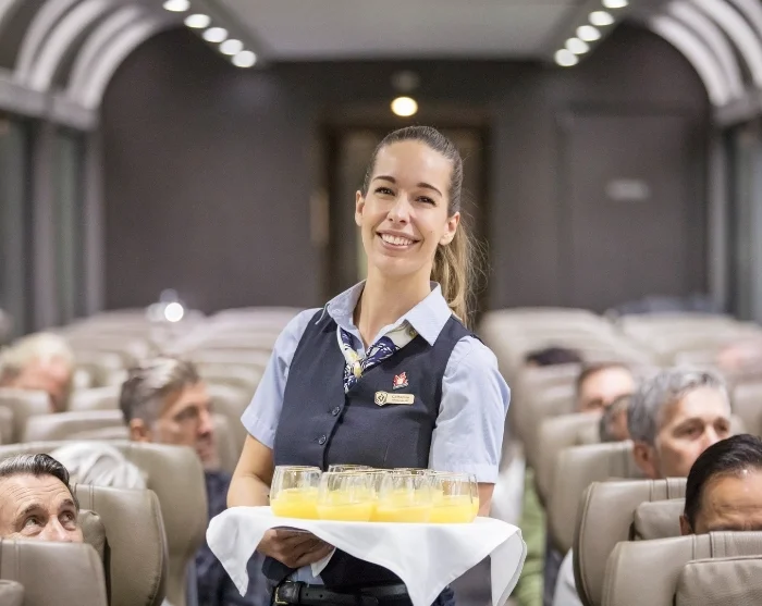 Med åbne arme og rød løber bydes du velkommen af togets personale, der henviser dig til din plads. Efter turen er påbegyndt, er det tid til morgenmad. Du rejser som standard på Silver Leaf, hvor maden serveres ved din plads. Opgraderer du til Gold Leaf, nydes dagens måltider i togets spisekupé. Uanset, kan du glæde dig til en menu med frisk tilberedt mad lavet med lokale råvarer, og måltiderne er i sig selv noget at se frem til.