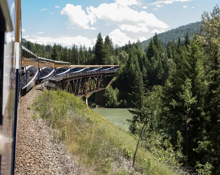 Herfra starter en togrejse i luksustoget, Rocky Mountaineer, der i dagtimerne tager dig igennem det canadiske landskab – fra Rocky Mountains dramatiske bjerglandskaber forbi vandfald, brusende floder og frodige dale til storbyen, Vancouver, der ligger ved Stillehavet. Du overnatter i westernbyen Kamloops undervejs for at få optimalt udbytte af det utrolige landskab.