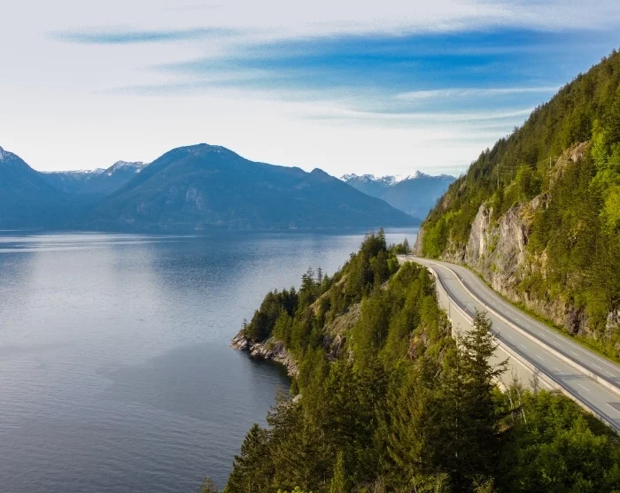 Selvom du på nuværende tidspunkt allerede har kørt på adskillige ikoniske veje, så er dagens rute på knap 1,5 time ingen undtagelse. Fra Whistler kører du på Highway 99 – bedst kendt som ”Sea to Sky Highway”. Som navnet antyder, får du nemlig kontrasten mellem hav og himmelhøjderne at opleve i dag. Fra Whistlers bjerge til dybe fjorde.