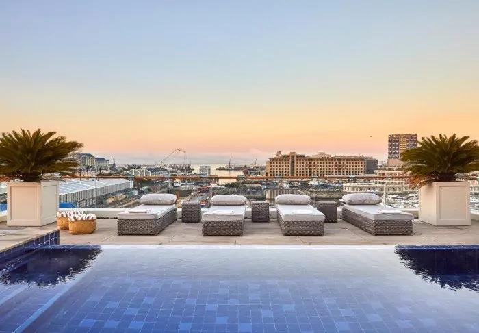 Spaen og swimmingpoolen ligger på sin egen ø i havnen og er nærmest omgivet af en tropisk have – midt i byen. I loungen kan du nyde en cocktail med udsigt til Table Mountain, mens du venter på dit bord på Afrikas eneste Nobu restaurant – den er populær, så bestil bord i god tid.