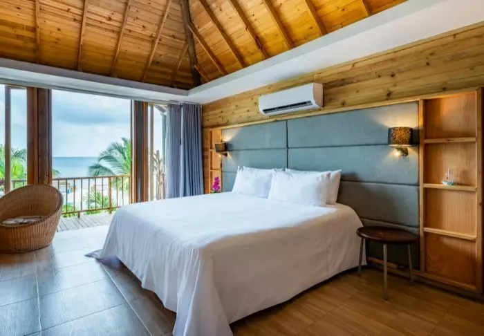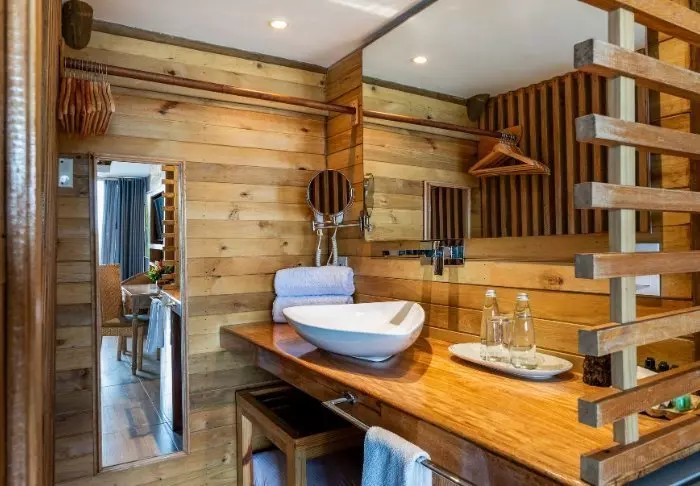 Hotellet har blot 42 værelser, så du er sikret et hyggeligt og intimt ophold. Alle værelser er bygget i træ og bambus og passer godt ind i de naturlige omgivelser. Værelserne er udstyret med aircondition, wi-fi, satellit-tv, minibar/køleskab, sikkerhedsboks og eget badeværelse med toiletartikler.