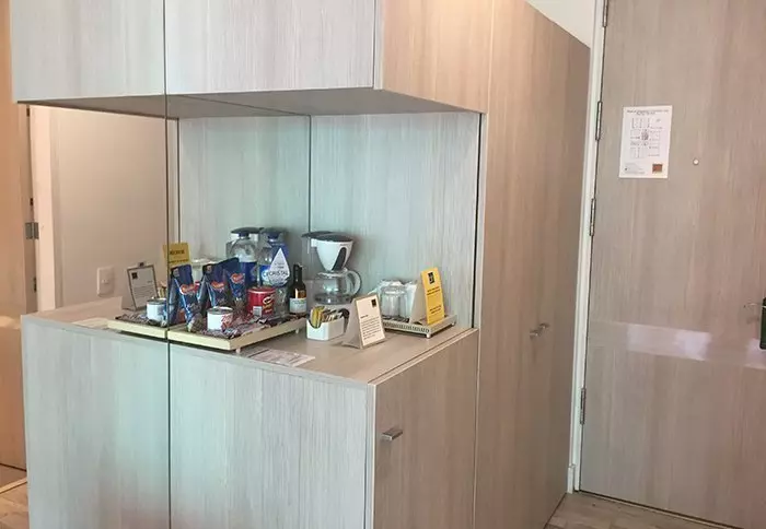 Hotellet har ingen restaurant, men din inkluderede morgenmad serveres ved små borde i et lille gangområde. Det fungerer ganske udmærket.
