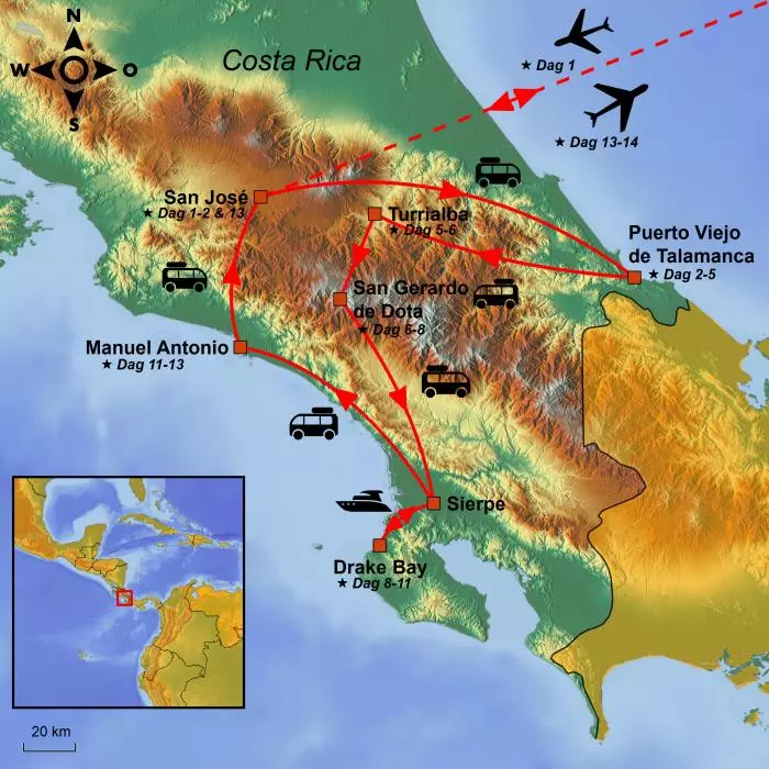 Fra San Gerardo de Dotas eventyrlige tågeregnskov går turen videre ad snoede bjergveje mod Costa Ricas stillehavskyst og byen Sierpe. Her bliver du samlet op af en speedbåd, som sejler dig det sidste stykke ud til Drake Bay. Turen går med fuld fart gennem snoede kanaler, omgivet af frodig regnskov, inden du når ud til Stillehavet og sejler langs kysten det sidste stykke til Drake Bay.