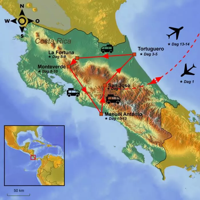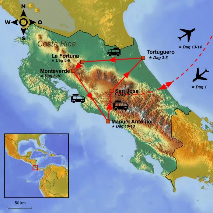 Rejsen starter i Costa Ricas hovedstad San José og går herfra til den frodige jungle i Tortuguero Nationalpark. Her er du omgivet af smuk natur og et spændende dyreliv, og al transport foregår i båd ad Tortugueros mange kanaler.