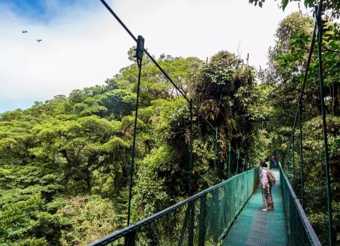 Her venter dig en spændende vandretur på ca. 2,5 kilometer i trætoppene! Mens du går på hængebroer mellem træerne, vil du kunne mærke den helt særlige og mystiske stemning, som tågedannelsen giver dette fortryllende landskab. Du er omgivet af orkidéer, bregner, mos, enorme træer og utallige plantearter, der vokser på træernes stammer. Fra den magiske skovs trætoppe kvidrer farverige fugle som den gyldenbrynede organist, den kobberissede smaragd, quetzal-fuglen og mere end 400 andre fuglearter, der gør skoven til et sandt paradis for fugleinteresserede.