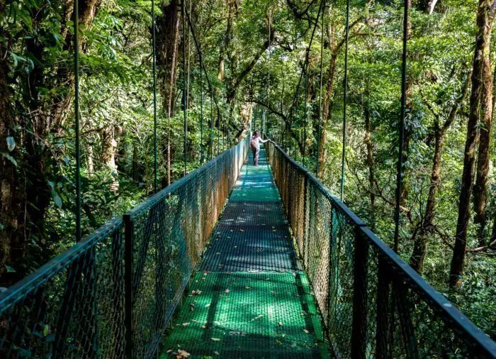 I dag skal du opleve Monteverdes enestående tågeregnskov på en spændende og til tider mavekildrende vandretur ad hængebroer i træernes toppe! Turen er ca. 2,5 kilometer lang, og heroppefra kan du på nært hold studere skovens enorme træer, orkidéer, bregner, mos og utallige plantearter, der vokser på træernes stammer. Du har en guide med, som fortæller om områdets imponerende antal plante-, dyre- og insektarter.