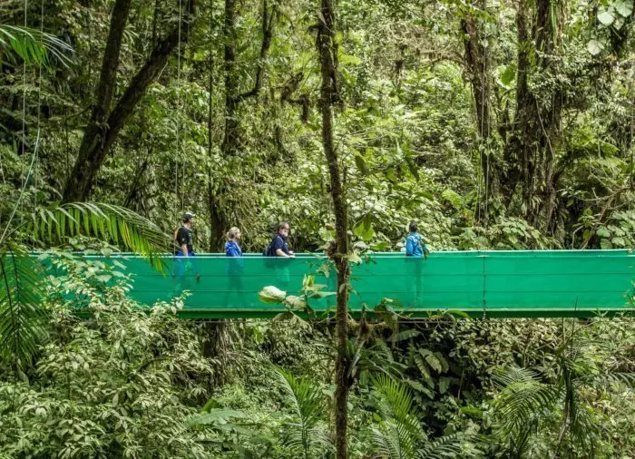 Tågeskovens eventyrlige landskab kan opleves på flere måder, bl.a. fra oven på en 2,5 km vandretur ad hængebroer i trætoppene. Du kan også prøve at zipline, som er en mavekildrende aktivitet, hvor du fastspændt i kabler suser blandt trætoppene.