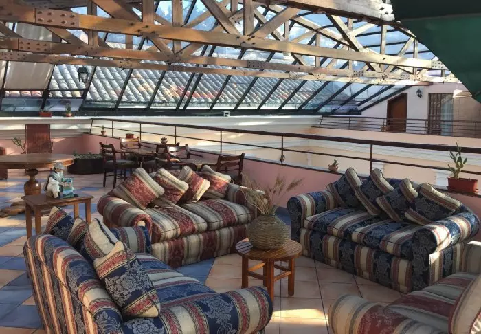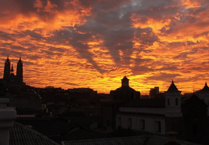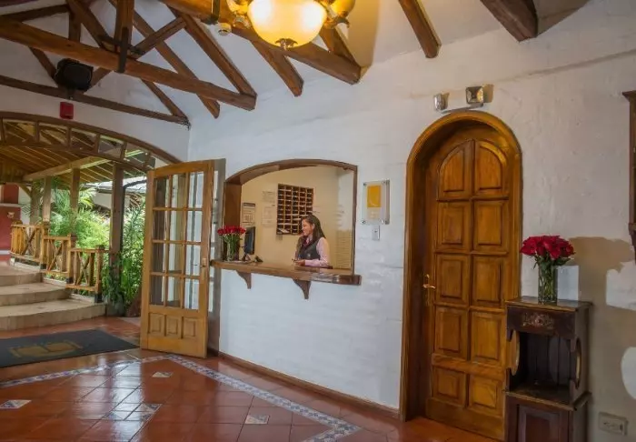 Efter en spændende dag i Quito kan du slappe af i hotellets lille loungeområde eller på den udendørs terrasse, hvor du kan se solen gå ned bag bjergene.