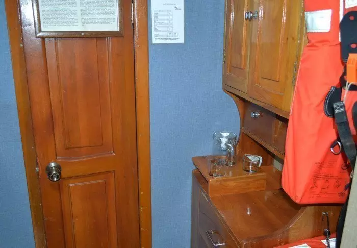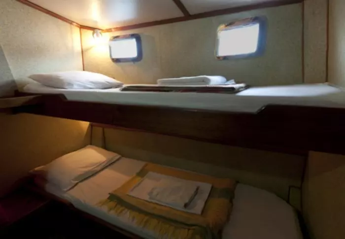 Båden har blot 8 kahytter med plads til 16 passagerer fordelt på 3 dæk. Kahytterne er små med køjesenge, men har alle eget toilet og aircondition. Vi benytter de kahytter, der ligger på mellemste og øvre dæk, hvor der er mindst motorstøj.