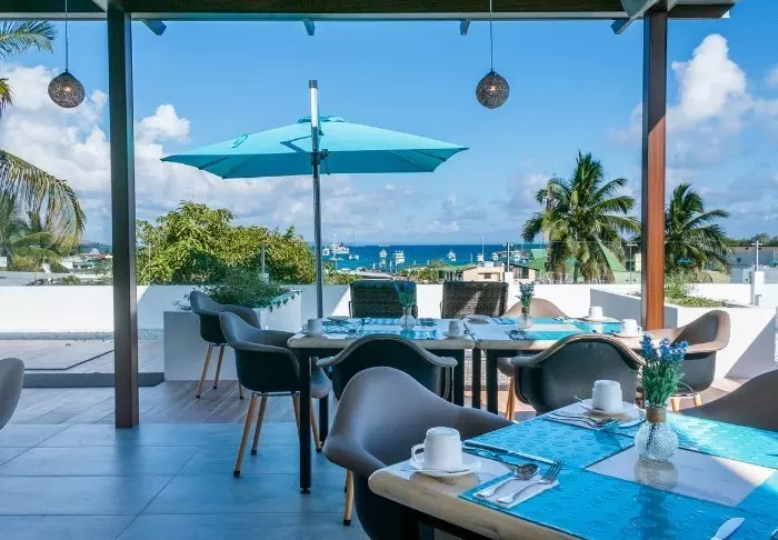 Hotellets restaurant, La Terraza, er beliggende på hotellets tagetage, med en skøn udsigt ned til den hyggelige havn og den omkringliggende natur. Her nydes din inkluderede morgenmad i den friske morgenbrise. På udvalgte dage er det også muligt at spise aftensmad heroppe.