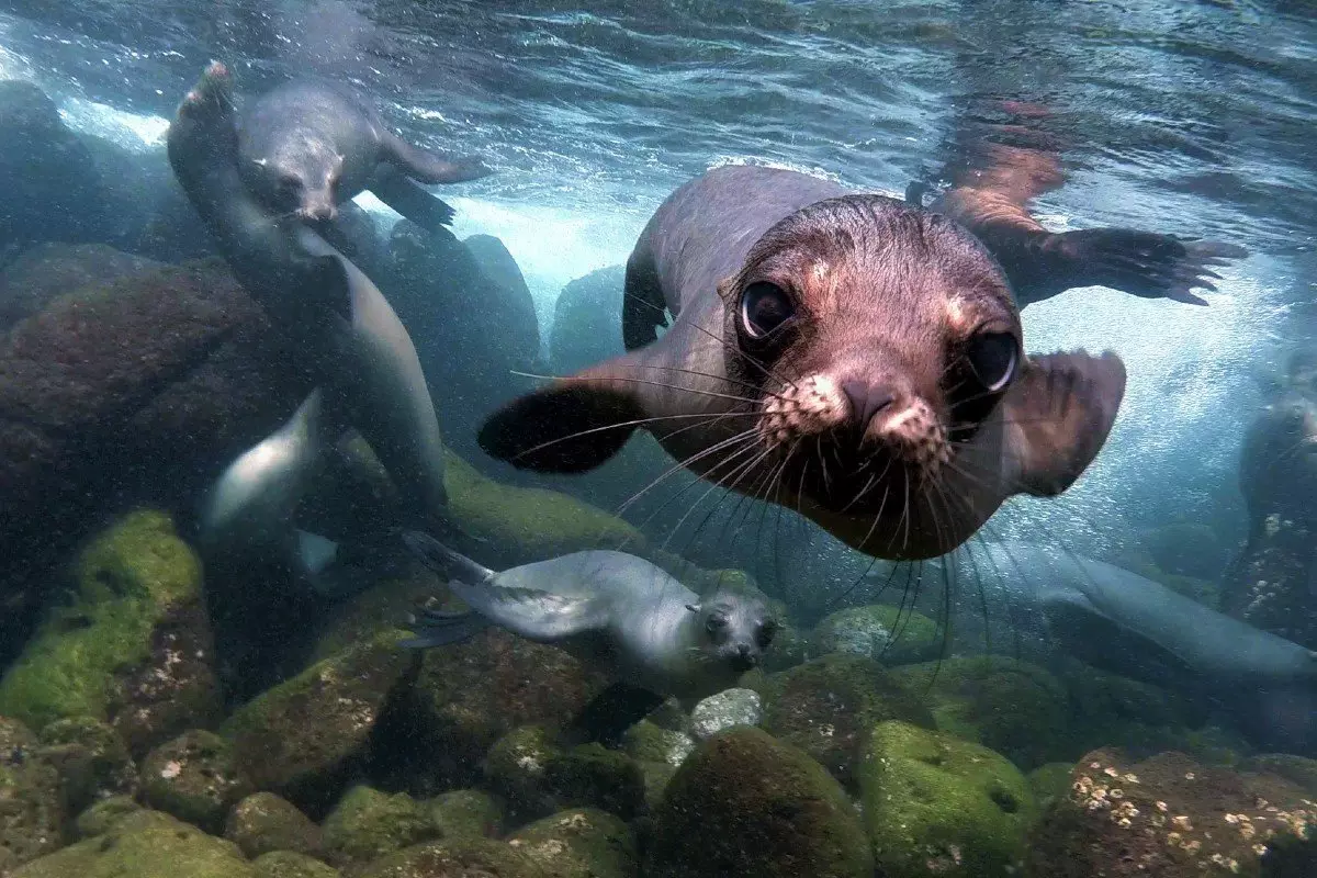 Frokosten nydes tilbage på båden, og bagefter er det tid til en snorkeltur i det klare havvand, hvor flotte farverige fisk venter. Et af dagens absolutte højdepunkter er at svømme sammen med de nysgerrige og legesyge søløver.