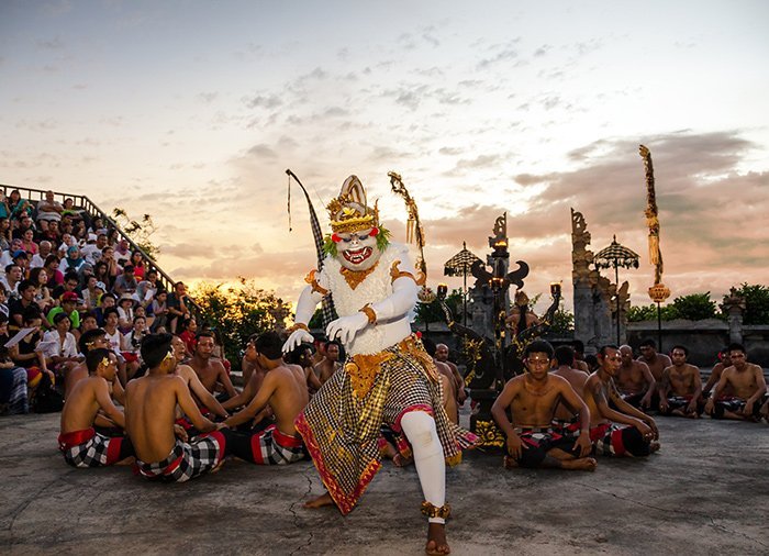 I skumringen og solnedgangen opføres den traditionelle balinesiske Kecak dans af en stor flok mandlige dansere. Den berømte balinesiske dans skildrer den gamle historie om kong Rahwana, der fanger Ramas kone, Sita. Dansen viser kampen mellem Rahwana og abernes leder Hanoman.