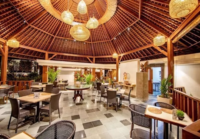 I løbet af dagen kan du forkæle dig selv med lette anretninger og kolde drikke på Heliconia Restaurant, mens aftenen byder på kulinariske oplevelser på The Beach Restaurant. Her kan du nyde balinesiske specialiteter, friskfanget fisk og skaldyr samt internationale retter under åben himmel med udsigt over havet. Aftenen kan du afslutte på Puri Bar, hvor du kan nyde et koldt glas vin eller en farverig drink til afslappende musik og himlens rødglødende farver, inden en ny dag begynder.