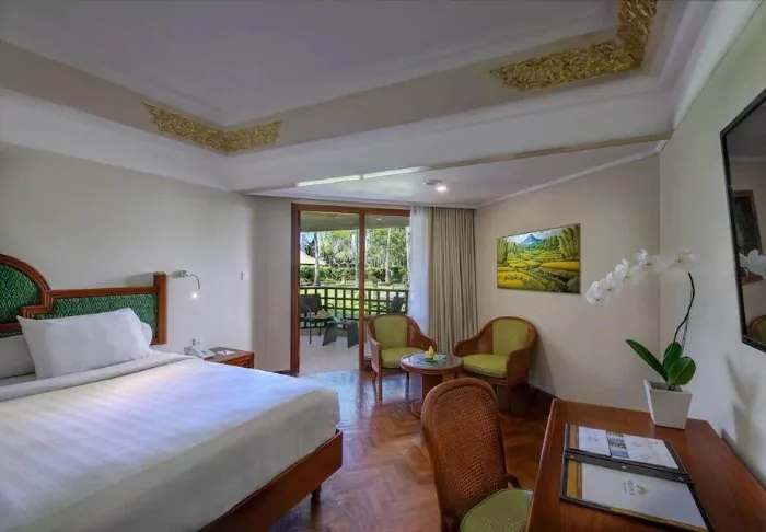 Du bor som udgangspunkt i et Wisma Seni Superior-værelse, som er resortets nyeste værelsestype. Værelset er elegant indrettet i balinesisk stil og omgivet af frodige rismarker og en organisk formet swimmingpool. Det er lyst og rummeligt med aircondition, tv, værdiboks og wi-fi. Den private balkon med bord og stole indbyder til afslapning med udsigt over de grønne omgivelser. Badeværelset er indrettet i balinesisk stil med separat toilet, vaskearrangement og bruseniche.