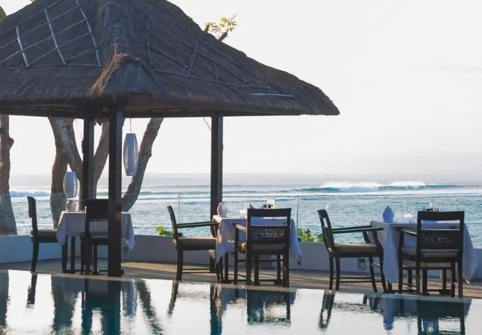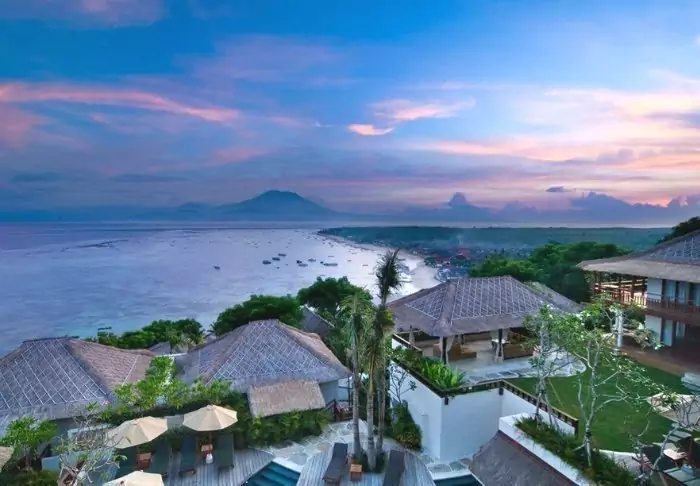 Batu Karang Lembongan Resort ligger på en koralskråning over Jungut Batu-stranden med udsigt til Badung-strædet og den storslåede vulkan Mt. Agung på Bali.