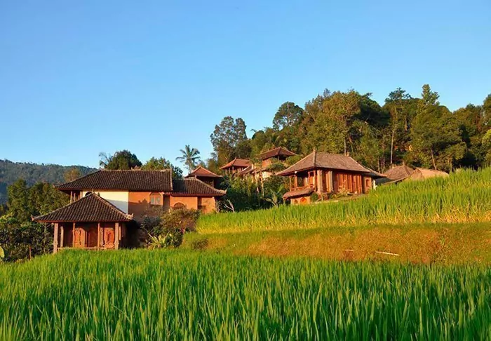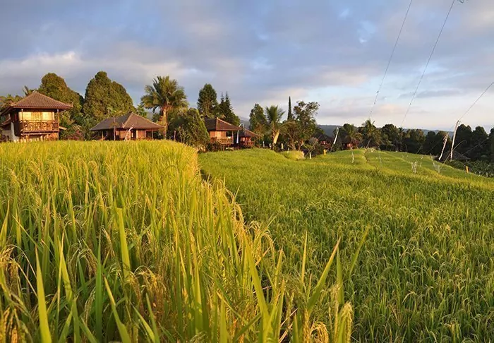 Du bor i charmerende bungalower kaldet ”lumbung”, som oprindeligt var gamle rislader. Alle bungalower er indrettet i traditionel stil og med fine detaljerede træudskæringer. De har alle soveværelse med myggenet over sengen, badeværelse med enten bruser eller badekar og en dejlig balkon med en betagende udsigt over bjerge og rismarker. Der er gratis wi-fi, men til gengæld ingen aircondition – det er nemlig ikke nødvendigt i det tempererede højland.