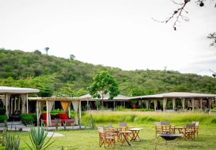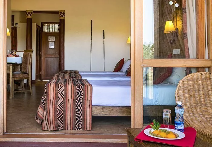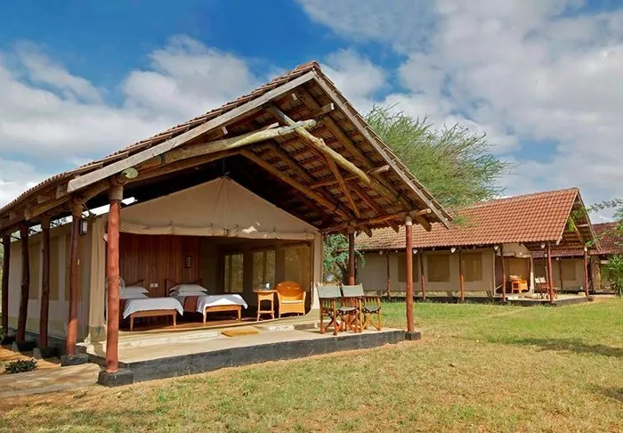 De rummelige hytter ligger spredt på den 200 hektar store ejendom i omgivet af de smukke haver. Der er i alt 83 værelser, alle med veranda, badeværelse og toilet. Indretningen er holdt i varme jordfarver og der er tillige vægmalerier inspireret af Masai kunst i nogle af værelserne.