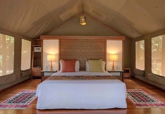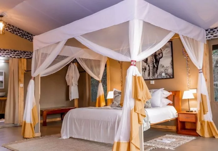 Her er 73 telte i forskellige størrelser, som er utroligt charmerende indrettet. Teltene har delvis murede vægge til bl.a. badeværelset, og der er fast gulv overalt. Siderne og taget er dog lavet af kanvas, så du får det begge af bedste verdener; en telt-værelse midt i den smukke afrikanske natur!