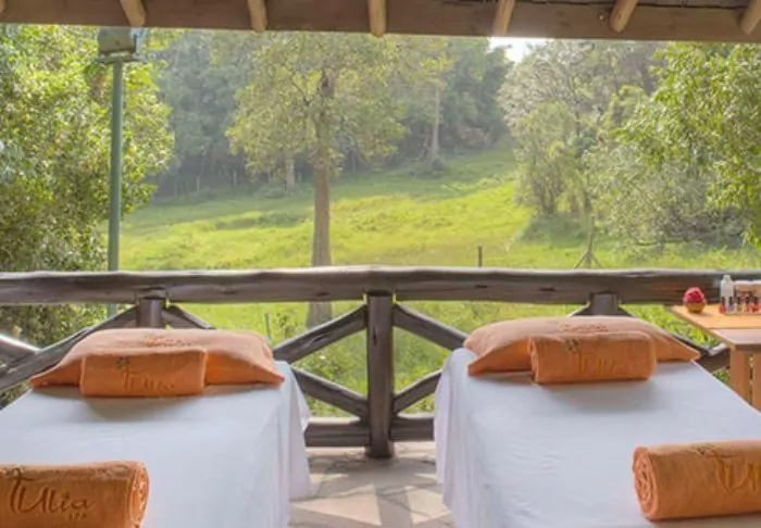 Også fra poolen er der en flot udsigt, og er kroppen mørbanket efter timerne i safaribilen, kan den lille spa byde på en god gang massage.