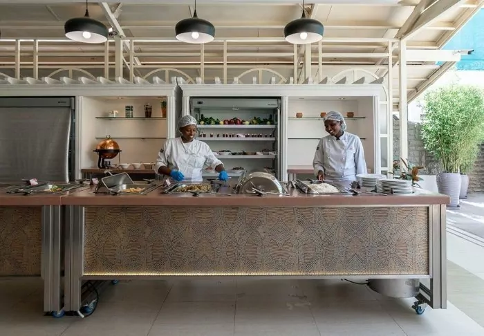 Lodgen har en central stråtækt spiseplads og en bar bygget i natursten. Spidsepladsen og baren er forbundet med en terrasse som har direkte udsigt ned til vandhullet.