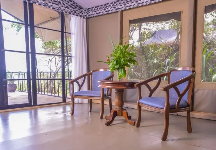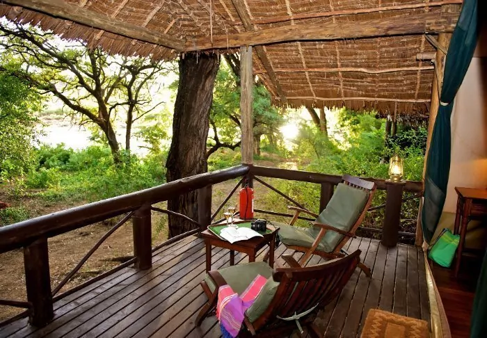 Alle teltene har vifte, drikkevandsbeholder samt myggenet omkring sengene. Her er masser af plads til bagagen samt en hyggelig læsekrog. På verandaen er der gode siddepladser, og det er nærliggende at tage et glas vin med fra baren og nyde solnedgangen over den afrikanske savanne herfra.
